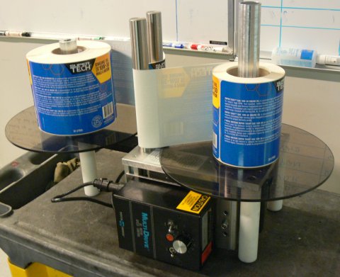 The "High Speed Label Roll Rewinder" allows for rewinding label rolls up to 300mm (12") in diameter. Rolls can be rewound to switch both "leading" and "trailing" ends of the label, and change rolls from "inside wind" to "outside wind", and vice versa.